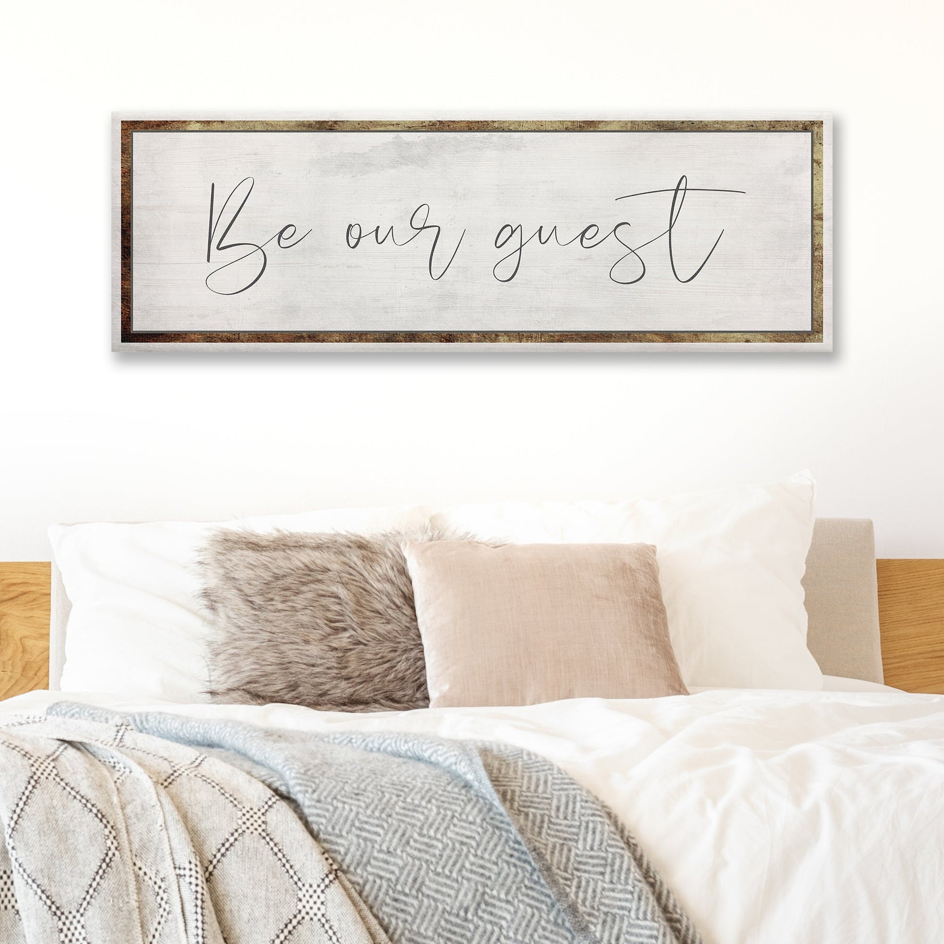 This Be Our Guest sign is a great living room wall piece to welcome your guests. You can customize this Be Our Guest canvas print with your family name to make it more personalized or any text you like.