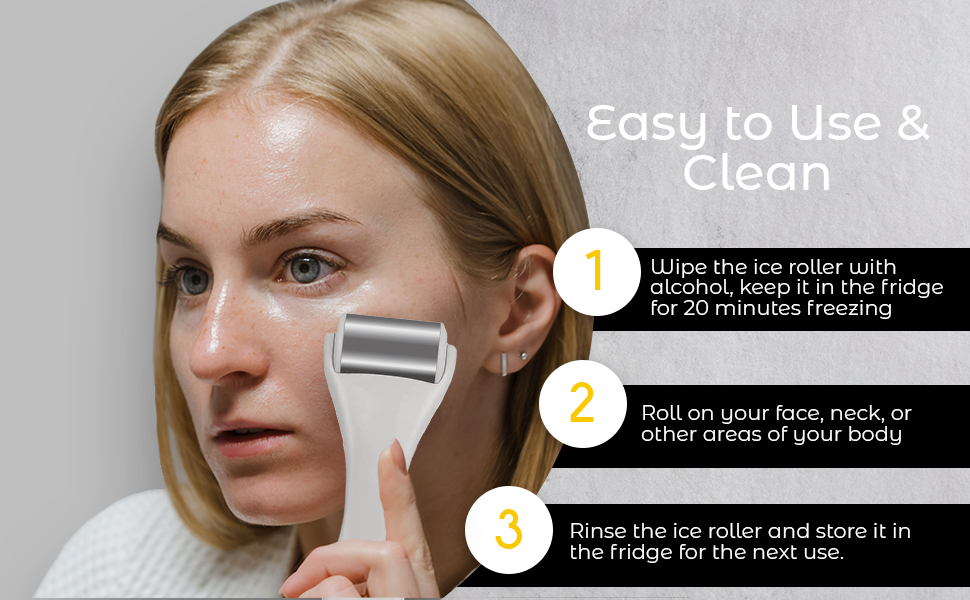 - EASY TO USE AND CLEAN. 1) Wipe the ice roller with alcohol and keep it in the fridge for 20 minutes, freezing; 2) Roll on your face, neck, or other areas of your body; 3) Rinse the ice roller and store it in the fridge for subsequent use.