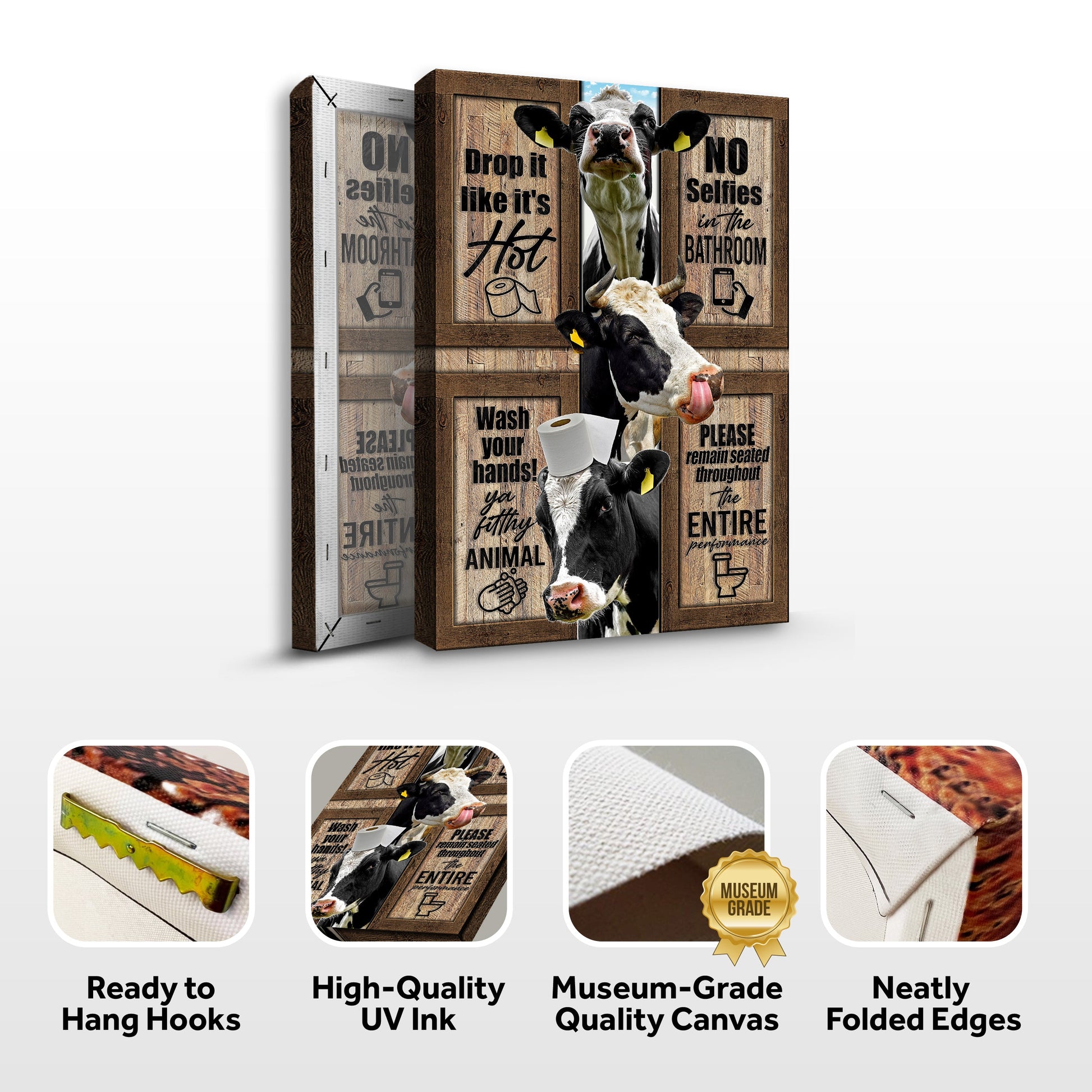 Are you looking for a creative and entertaining way to give your bathroom personality? View our sign that reads "Cow Bathroom Rules"! Three different sizes of this adorable piece of wall art are available, and you can even add your own set of rules to the canvas print of the Cow Bathroom Rules. Whether you go all out or keep it simple, our Cow Bathroom Rules canvas wall art will definitely liven up and bring some fun into your room. So get a Cow Bathroom Rules canvas wall decor today and make your bathroom the best it can be!