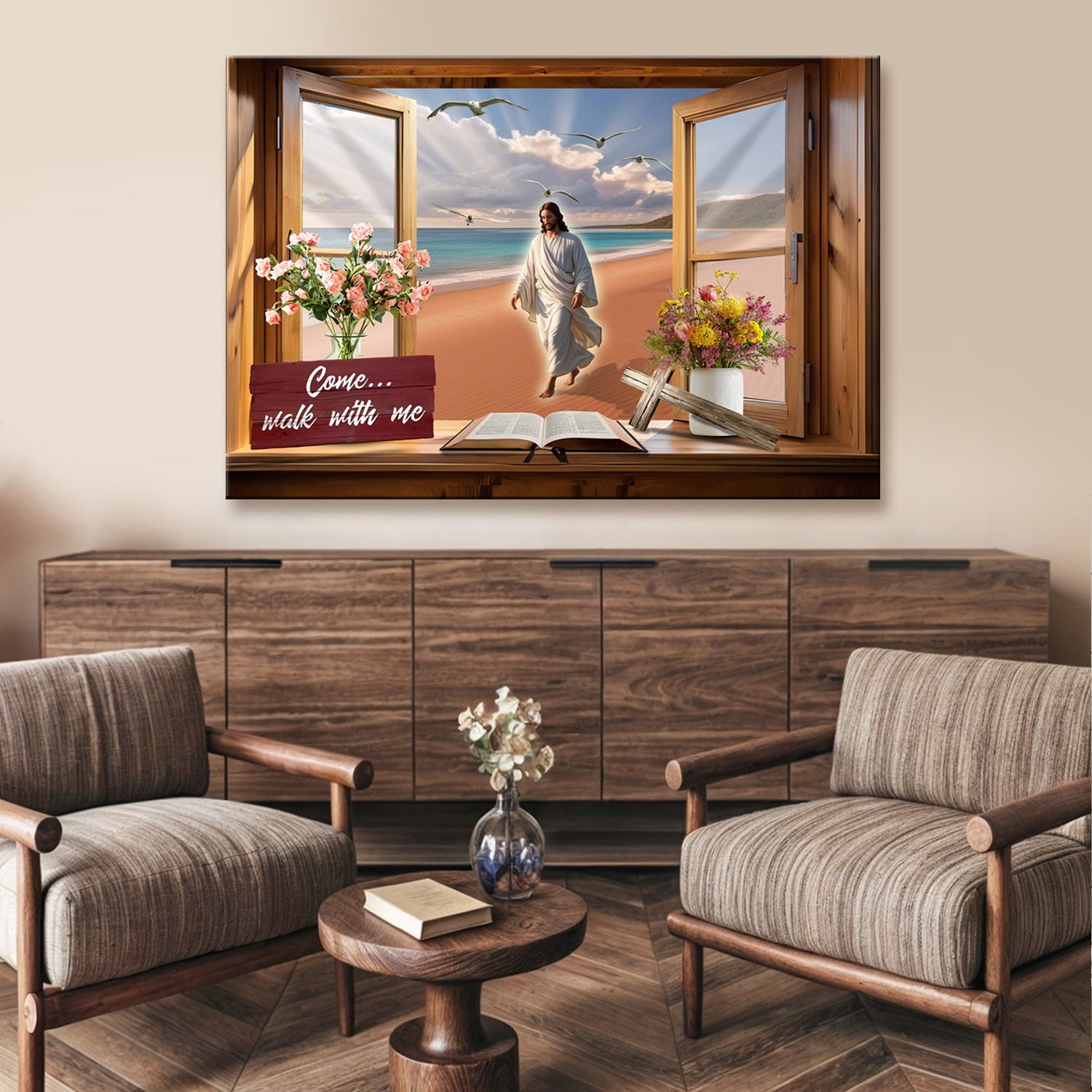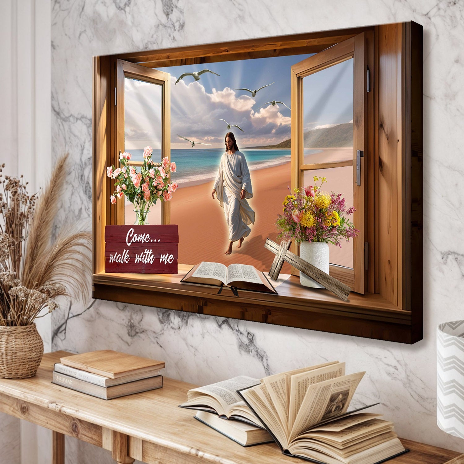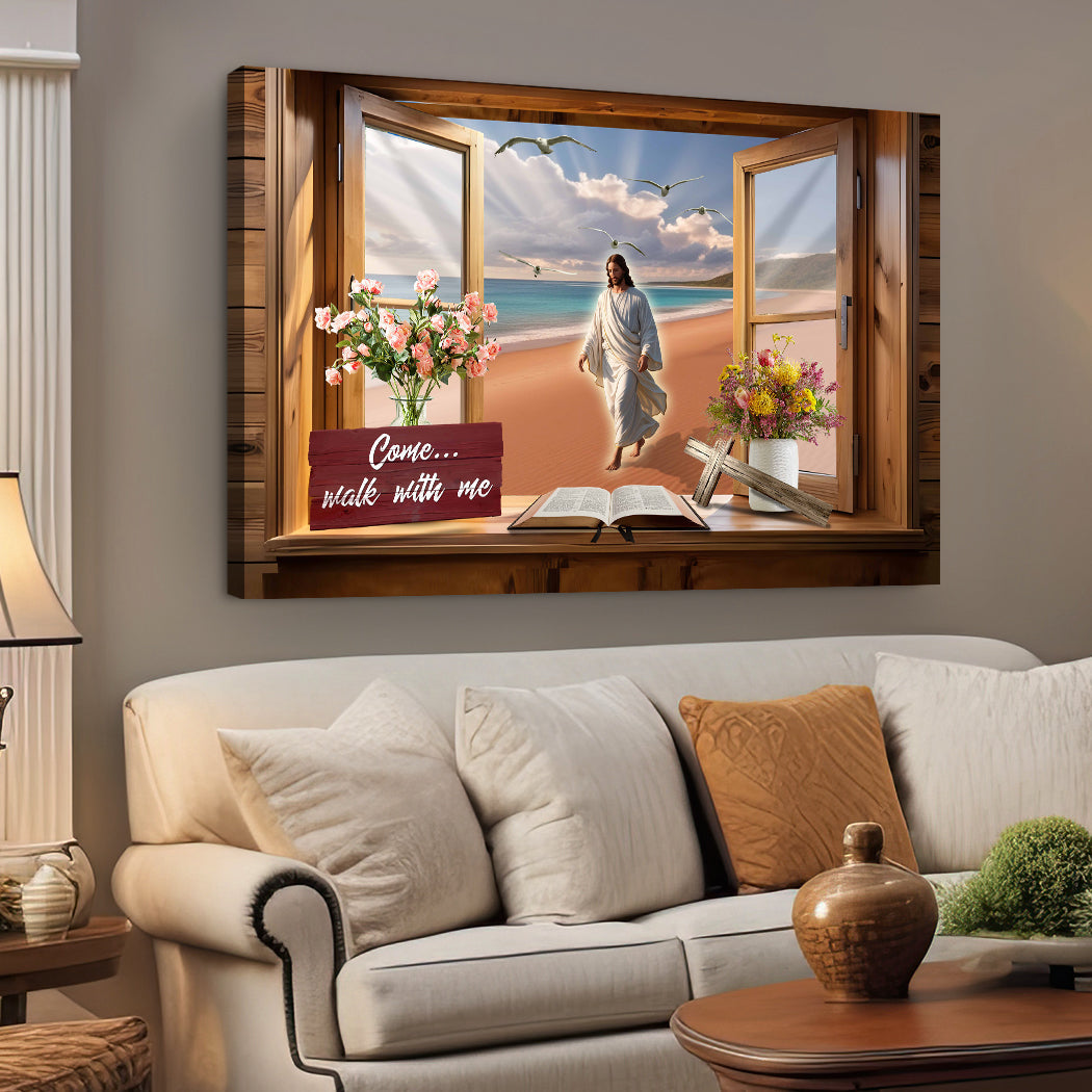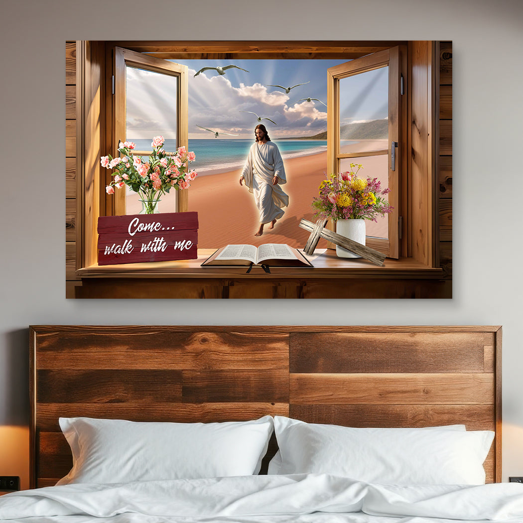 The scene is beautifully framed by a rustic wooden window, with vibrant floral arrangements, an open Bible, and a wooden cross, enhancing its spiritual ambiance. The phrase "Come... Walk with Me" invites reflection and strengthens the feeling of divine presence in your home.