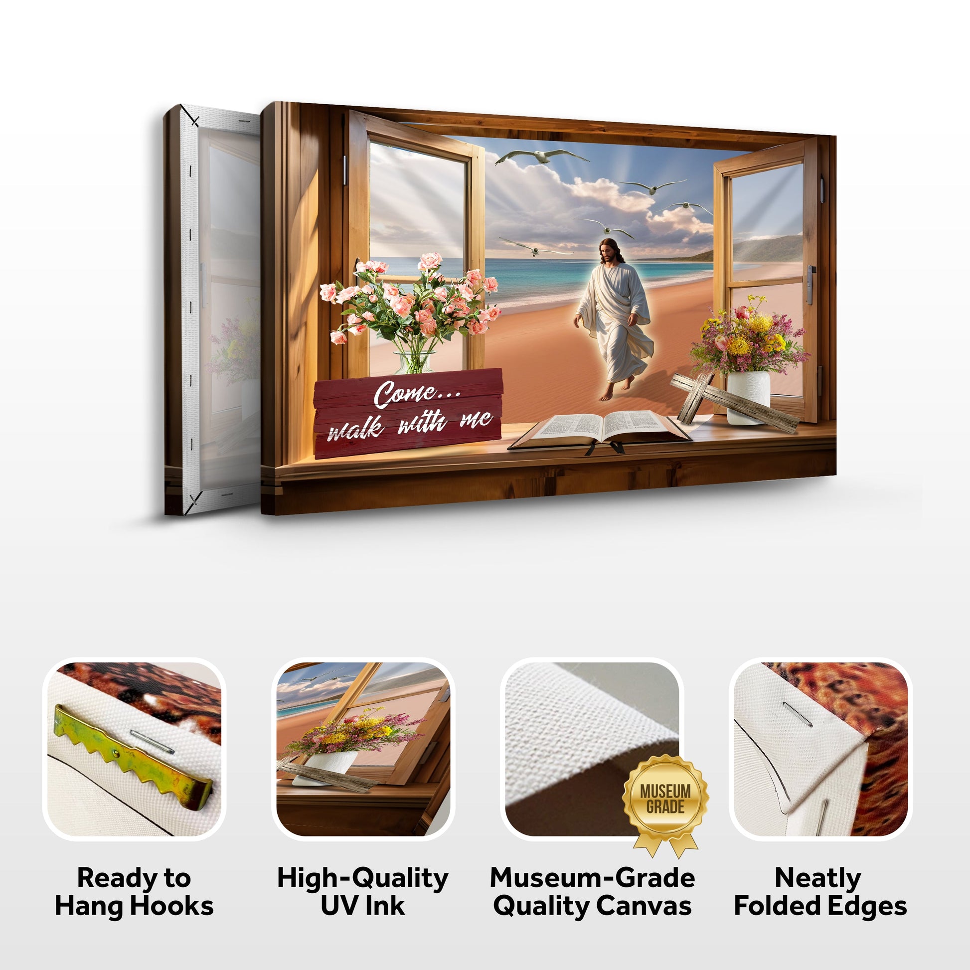 Transform your space with this breathtaking faith-inspired canvas that creates the illusion of an open window looking out onto a serene beach. Featuring Jesus Christ walking along the shore, this artwork symbolizes peace, faith, and divine guidance.