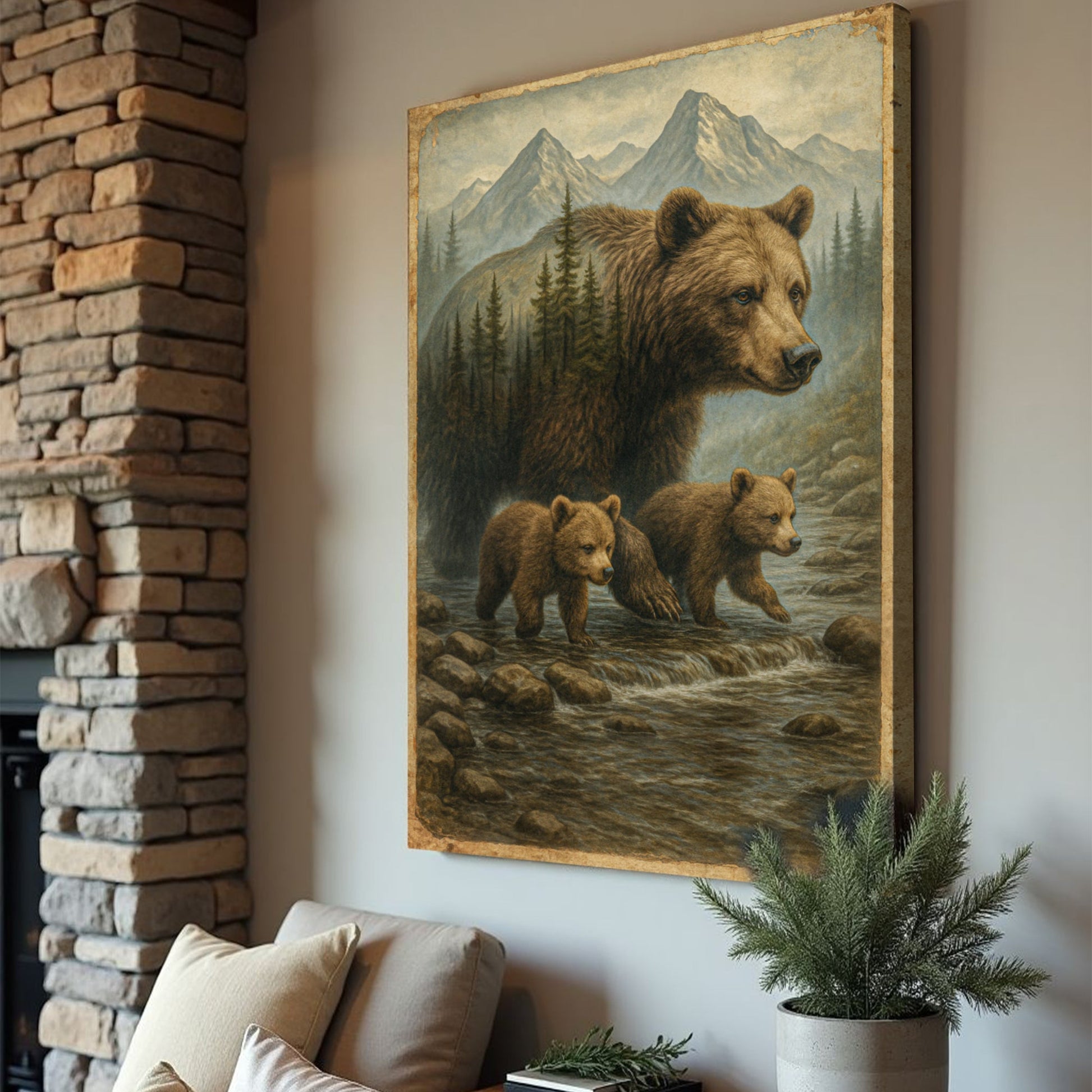 Mother Bear and Cubs Crossing Double Exposure Wall Art