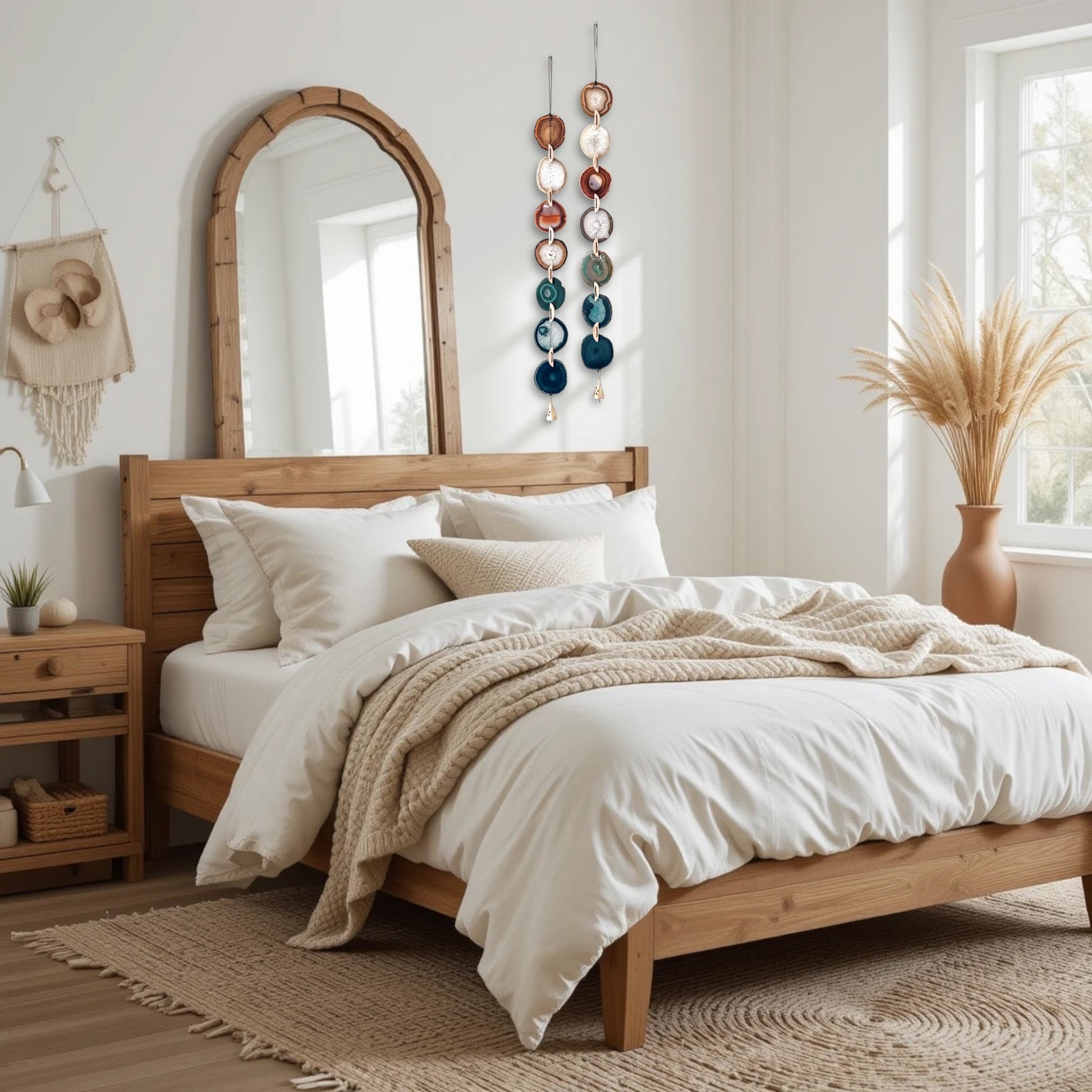 A fresh, neutral take on one of our most loved garlands. This piece features creamy white and soft natural agate slices hand-linked with sustainable leather cording. Optional vintage-inspired brass bells add a gentle, earthy chime and an elegant finishing touch. Designed to bring effortless boho warmth to any room while staying light and airy.