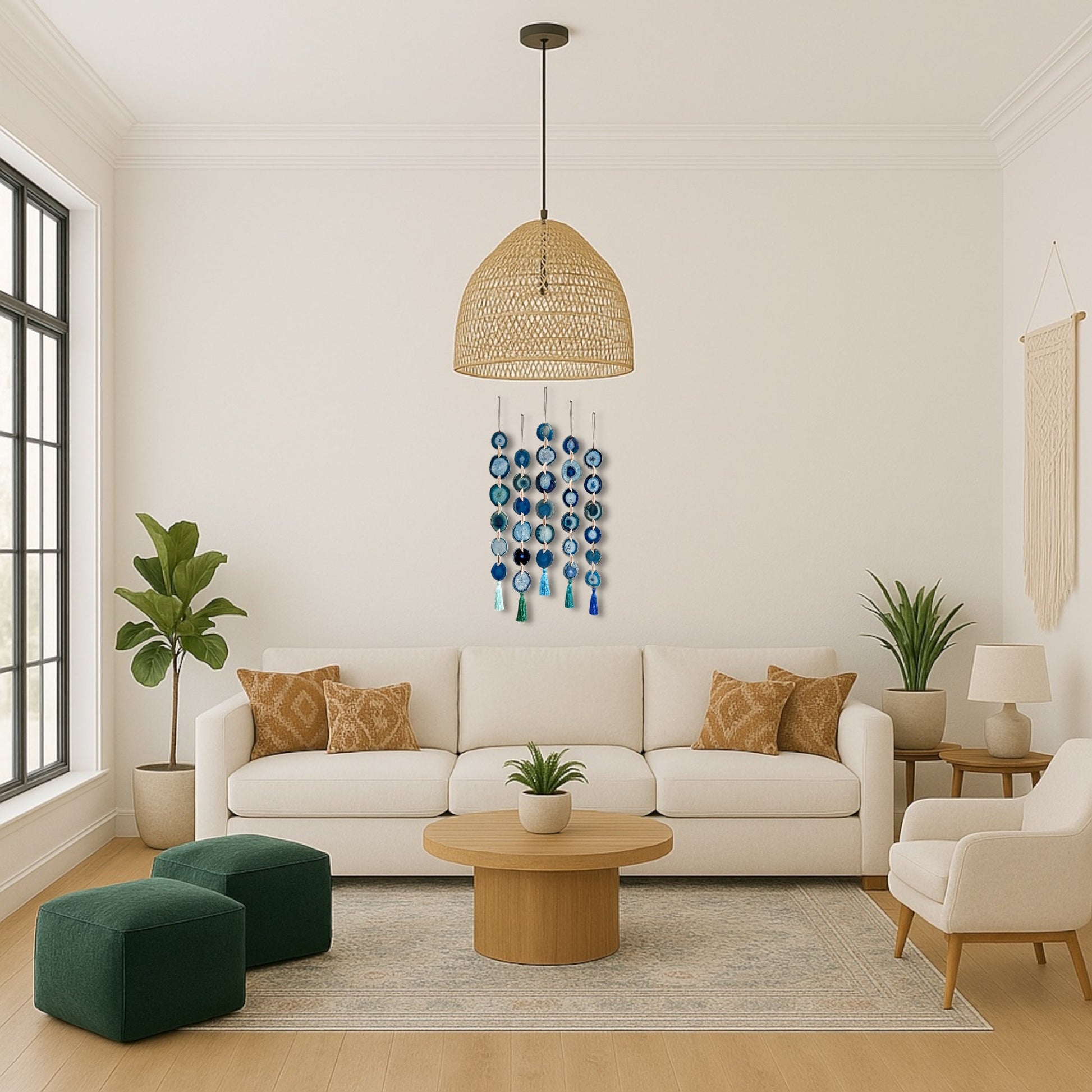 Inspired by the mystical beauty of the ocean, the Ocean Agate Garland Wall Hanging brings the calming energy of the sea into your home. This handcrafted wall hanging features genuine Brazilian agate slices in stunning oceanic hues—ranging from deep blues and teals to foamy aquas and sea greens. Suspended from a natural wood hanger with leather cording, this piece is a perfect blend of coastal serenity and bohemian elegance.